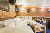 2. Русская банька (до 6 человек) - от 1200 руб/час, купель с прохладной водой 2х3, джакузи, печка с парогенератором, настольный теннис, гостиная с мягкой мебелью, аудио и видео аппаратура, караоке, комната отдыха.