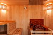 Эта двухъярусная сауна находится на скрытой от посторонних глаз территории с бесплатной, охраняемой автостоянкой. Дизайн выполнен в эльзасском стиле, для которого характерен интерьер не отличающейся декоративными особенностями, но при этом все выглядит практично и надежно, а хорошо подобранная цветовая гамма, большое количество ручной работы и естественный дневной свет на втором этаже создают уют загородного дома, что способствует расслаблению.