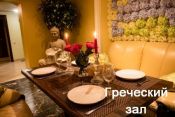 В интерьере гостиной, оформленной в греческом стиле, всегда господствуют умиротворенность, чистота и гармония. Тут оформлена необычайно комфортная трапезная зона с уютной мягкой мебелью и трапезным столом, где Вы можете отведать изысканные блюда из нашего ресторана. Стены украшены колоннами, зеркалами. Потолок украшен многочисленными светильниками, регулируемыми по Вашему усмотрению.