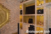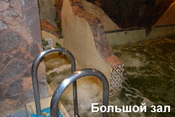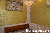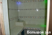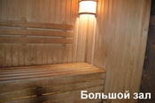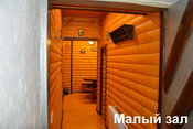 Малый зал - вместимость до 10 человек, русско-финская парная, купель 2х3. Имеется душевая комната, комната отдыха, караоке, спутниковое телевидение, кальян.