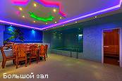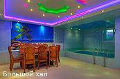 1. Большой зал - до 15 человек, бассейн 3х4, комната отдыха, русско-финская парная.