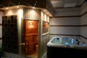 В этой сауне бассейн 4х5 с подогревом, гейзером, аэро и гидромассажем, противотоком и водопадом