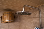 В этой сауне бассейн Деревянная купель на открытой веранде под крышей