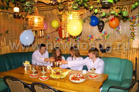 3. Тропики - на 15-20 человек (Выполнена в африканском стиле и напоминает тропический шалаш. Наличие в банкетном зале бамбука, пальм, экзотических фруктов, попугаев, стилизованных фигурок переносит наших гостей в жаркую атмосферу Тропиков.). Цена: